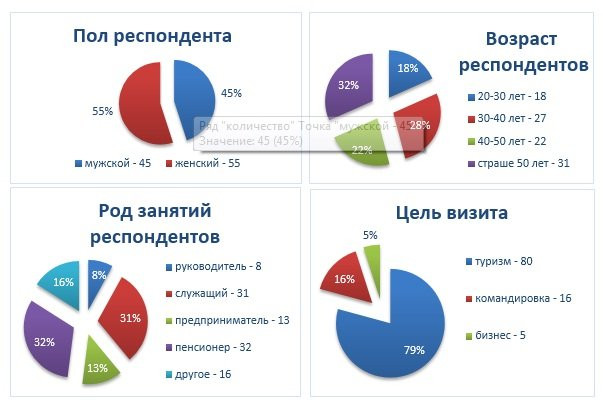 По роду деятельности большая часть респондентов — это граждане пенсионного возраста и служащие (32 % и 31 % соответственно от общего числа респондентов). Основной целью их пребывания на амурской земле является туризм (79 %). Находясь за рубежом, туристы основываются на информации, почерпнутой из рекомендаций друзей (48 %) и интернета (40 %).