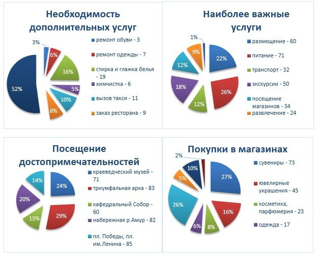В пояснительной записке к исследованию отмечается, что практически все участники опроса посещали основные достопримечательности города. Самыми популярными оказались площадь Ленина, площадь Победы. Их посещали 85 человек из 100. Видом Триумфальной арки насладились 83 % опрошенных, 82 % прошлись по набережной Амура. В краеведческом музее и кафедральном соборе побывали 71 и 60 человек соответственно.