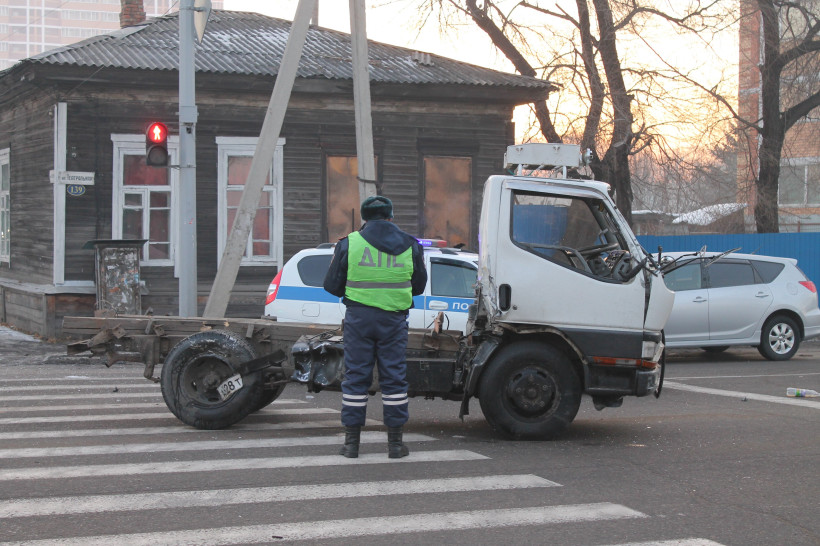 Сегодня утром, 10 ноября, в амурской столице на углу Театральной и Конной произошла авария с участием легкового автомобиля и грузовика с будкой. Как считают свидетели, легковой автомобиль пытался скрыться от экипажа ДПС.
