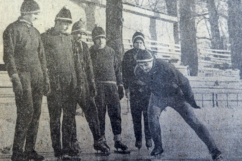 С наступлением зимнего спортивного сезона тысячи юношей и девушек встали на коньки и лыжи. У одних воскресная прогулка, у других подготовка к соревнованиям, у третьих учебный процесс. Этот снимок сделан на катке стадиона «Спартак», где обычно занимаются учащиеся техникума физической культуры. Преподаватель А. Вигура ведет занятия по конькам.