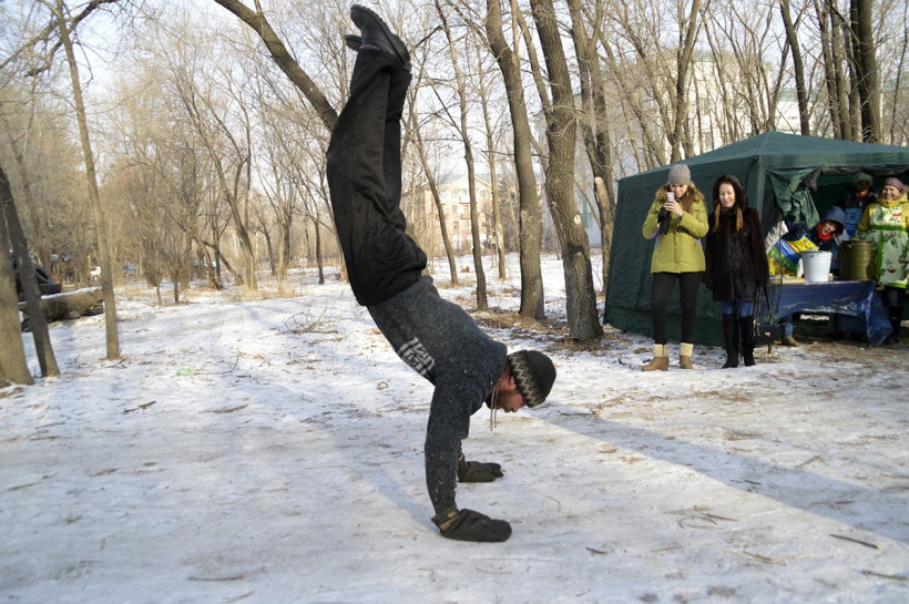 После обеда бродяги долго не расходятся. Толпятся кучками, делятся новостями, бедами и нехитрыми радостями. Тот самый Андрюха неожиданно скидывает тулуп и, размявшись, встает на руки. Небольшое представление под бурные и продолжительные аплодисменты.