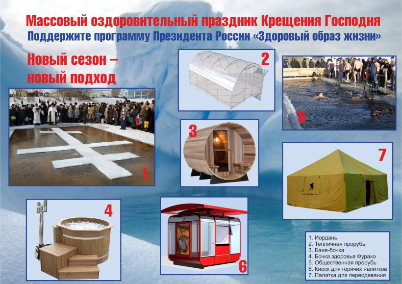 Также планируется поставить тепличную прорубь — теплицу, в которой будет небольшая раздевалка и прорубь. Кроме того, около традиционной проруби будут киоск для горячих напитков и палатка для переодевания.