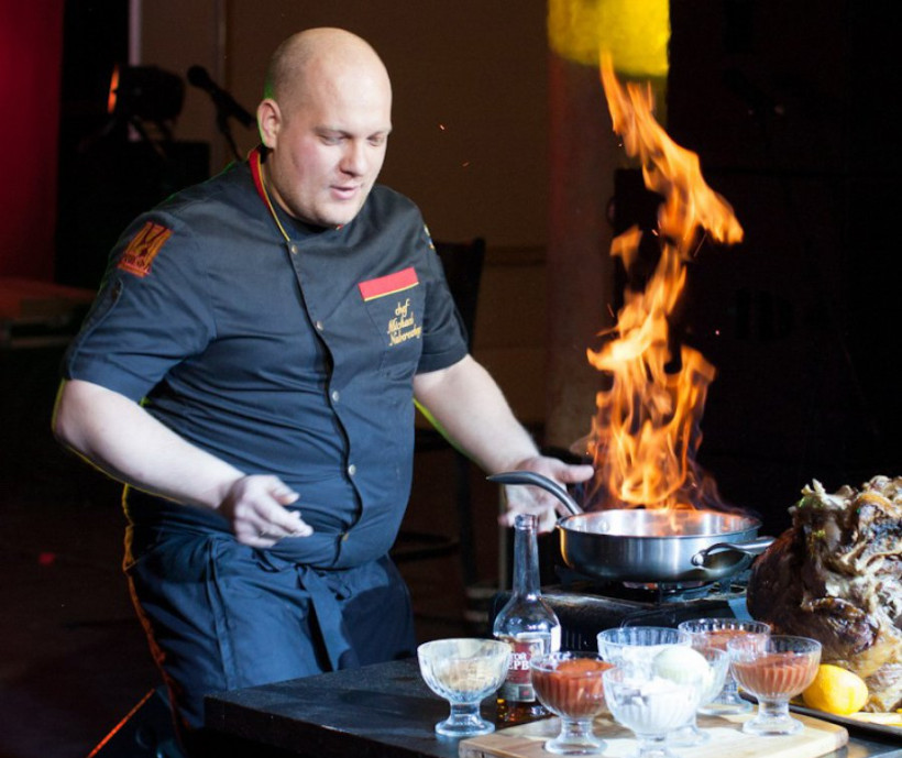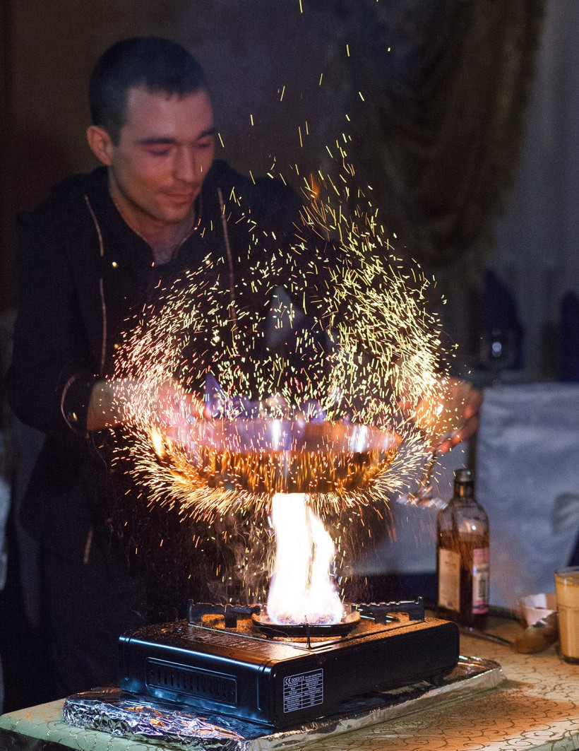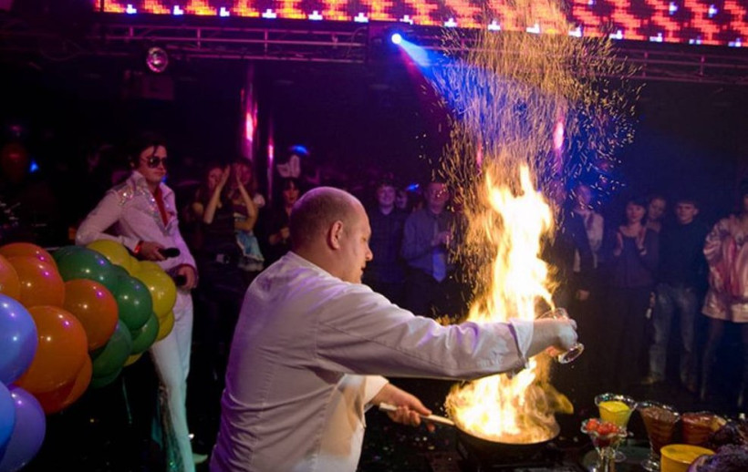 — Основное блюдо заранее маринуется и готовится на кухне незадолго до начала мероприятия, — поясняет Анастасия Геннадьевна. — Шеф-повар вывозит в зал сервированный стол с мясом, пылающим в огне, а затем на глазах у посетителей готовит соус к мясу — тоже зрелищно, с созданием огненного фейерверка. Любой из гостей, присутствующих в зале, может стать ассистентом шеф-повара по приготовлению фирменного соуса. Кстати, рецепт соуса уникальный, потому его держат в секрете. В его состав входит алкогольный напиток, поддерживающий горение. Как правило, это коньяк или ром.