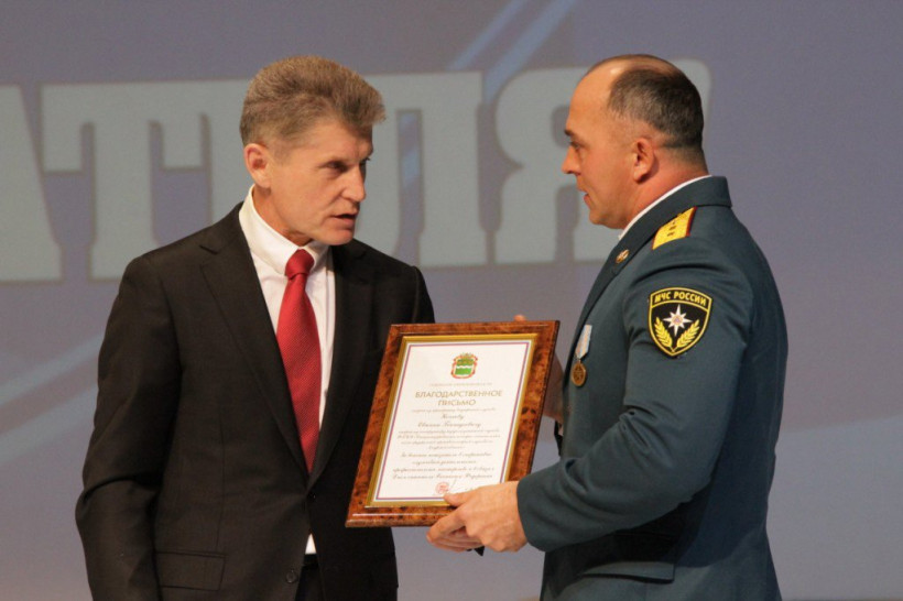 Губернатор Амурской области Олег Кожемяко от имени президента Российской Федерации вручил начальнику 55-й пожарной части Сергею Андрееву и командиру отделения 10-й пожарной части Вячеславу Сотнику медали «За спасение погибавших». За высокие показатели в оперативно-служебной деятельности, профессиональное мастерство и добросовестное исполнение служебных обязанностей глава региона вручил благодарственные письма инструктору газодымозащитной службы специализированной пожарно-спасательной части г. Благовещенска Евгению Кочневу, старшему инструктору ГЗДС СПСЧ Алексею Трощенкову, спасателям поисково-спасательного отряда Амурского центра гражданской защиты и пожарной безопасности Дмитрию Петрову, Игорю Политову, Павлу Рыжко, Виктору Рязанцеву, ветерану пожарной охраны Вячеславу Силаеву.