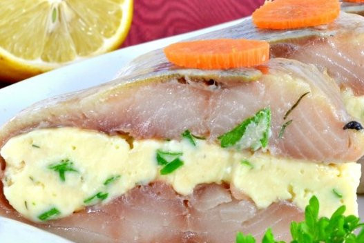 Отделить филе сельди от костей — у вас должны получиться две равные половинки. Подготовьте начинку: тертый на мелкой терке сырок смешайте с маслом и зеленью, капните для окраски немного свекольного сока. Равномерно распределите сырную массу по одной половинке сельди, сверху положите вторую, придавите, оберните пленкой и уберите минимум на 3 часа в холодильник. Перед подачей порежьте сельдь и выложите на блюдо, украсив кольцами маринованного в уксусе с сахаром лука.