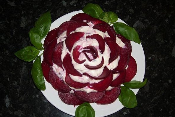 Две свеклы нарезаем тонкими кружочками и маринуем 10—15 минут в уксусе с сахаром. Еще две свеклы, морковь и картофель варим, нарезаем кубиками. Лук, сельдь и кальмары также измельчаем. Все продукты смешиваем, заправляем специями и соусом. Выкладываем на блюдо горкой и украшаем салат кружочками свеклы — размещаем лепестки таким образом, чтобы наша композиция напоминала розу. У кого не хватает фантазии — посмотрите варианты в интернете.