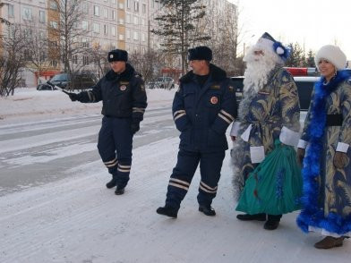 После Дед Мороз и Снегурочка отправились на улицы Тынды, где вместе с сотрудниками ГИБДД не только поздравляли с праздником маленьких и взрослых горожан, но и напоминали им правила дорожного движения, а также рассказали, как не попасть на улице в неприятные ситуации.
