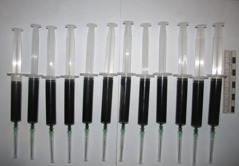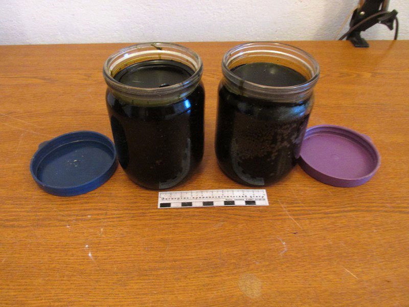 В доме задержанного прошел обыск. В кухне на нижней полке стола хранились 12 медицинских шприцев, а также две стеклянные банки емкостью 500 миллилитров и 257 миллилитров, наполненные гашишным маслом. В общей сложности оперативники изъяли 1 килограмм 520 граммов гашишного масла.