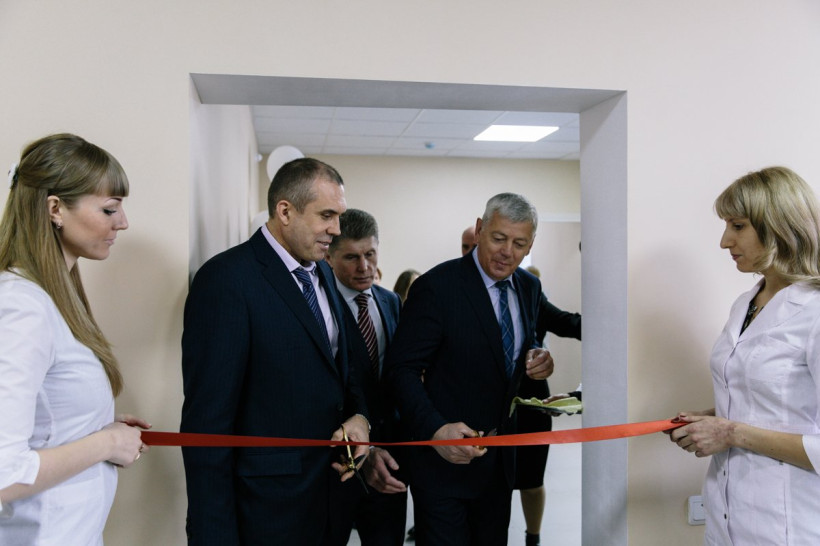 Перерезать красную ленточку приехали губернатор Олег Кожемяко и зампред правительства области, министр здравоохранения Николай Тезиков.