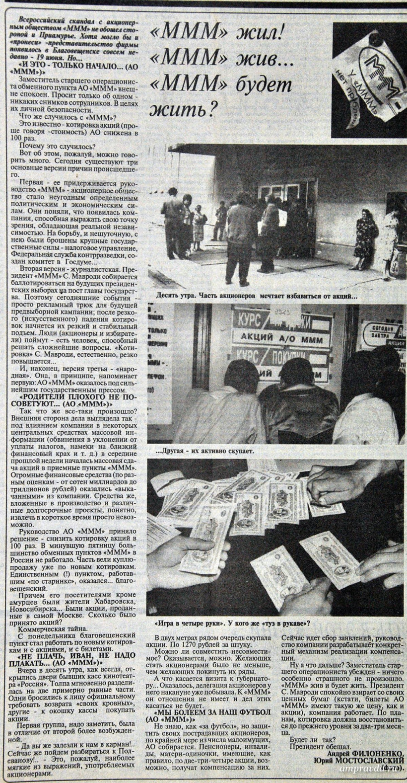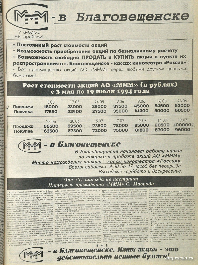 Летом 94-го на страницах «Амурской правды» публиковалась информация об открытии пункта продажи акций финансовой компании в Благовещенске, а также интервью с Сергеем Мавроди, который утверждал, что «на сегодняшний день МММ — бесспорно, самая надежная российская фирма».