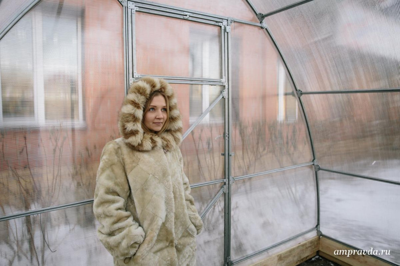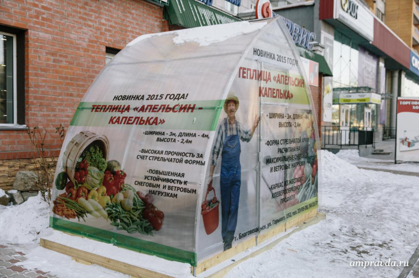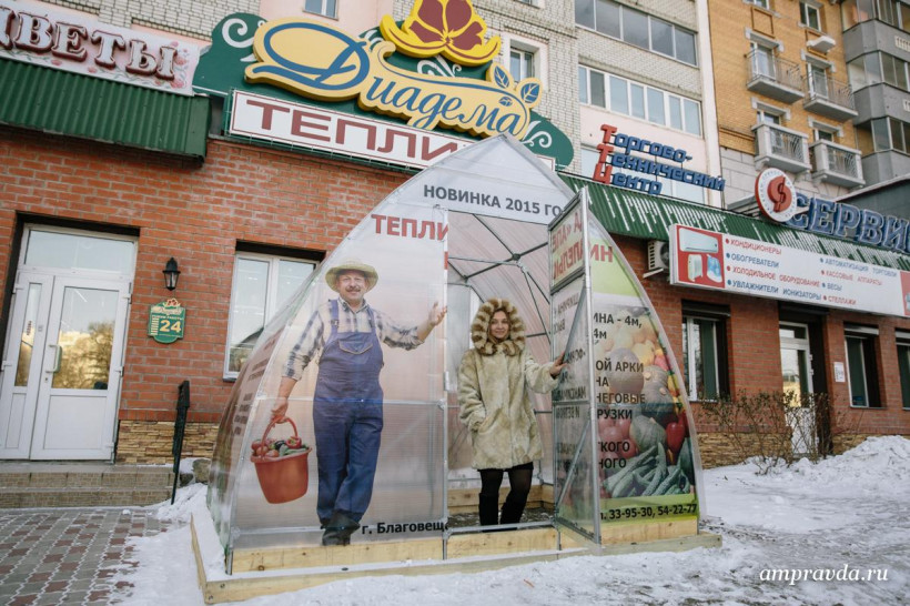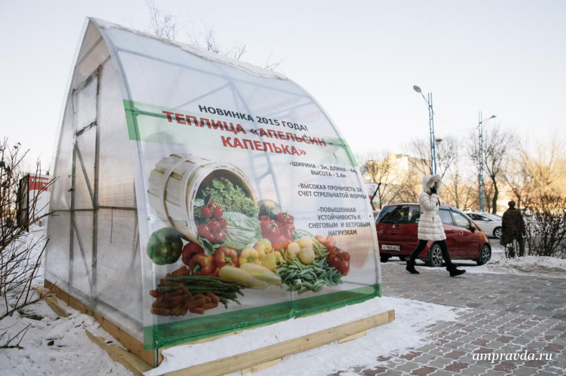 Для того чтобы любой желающий убедился, что теплица действительно защищает от амурских ветров и холодов, сотрудники установили образец теплицы возле салона.