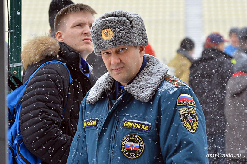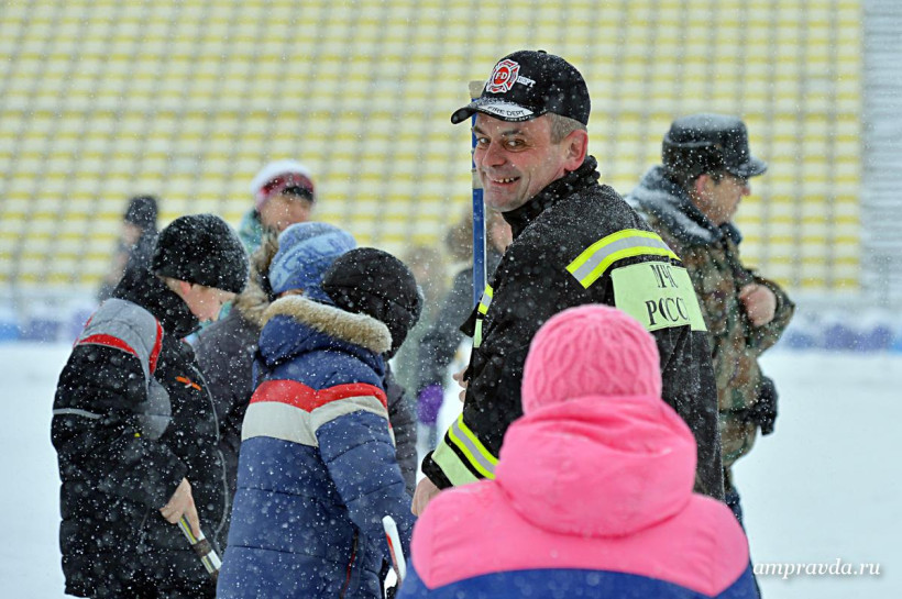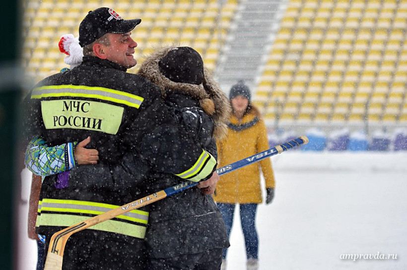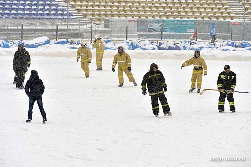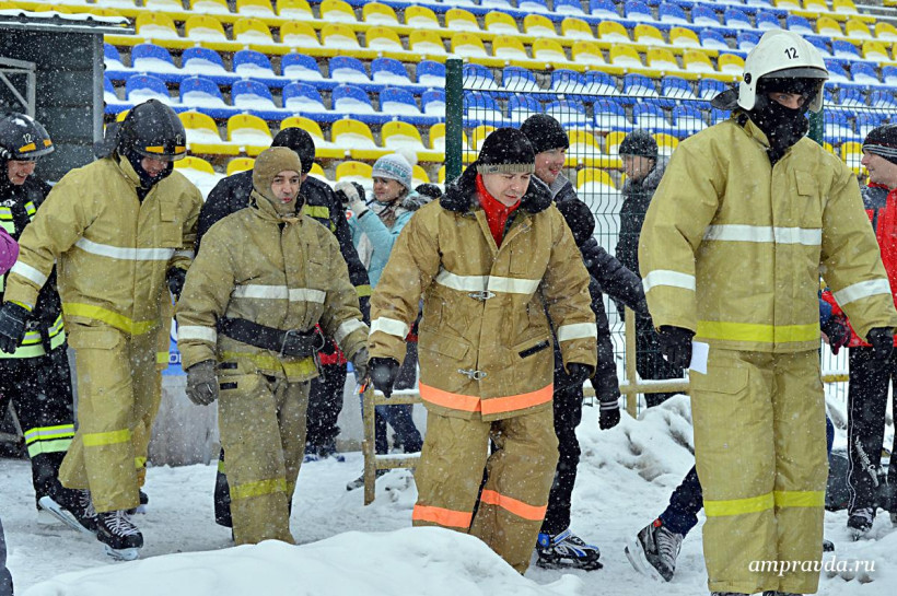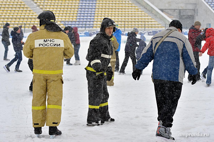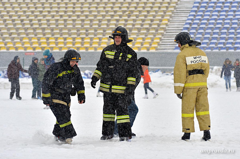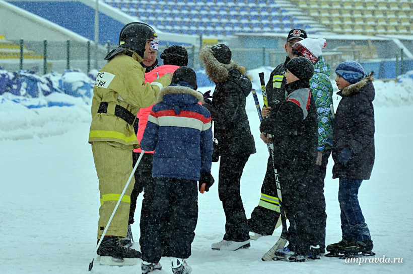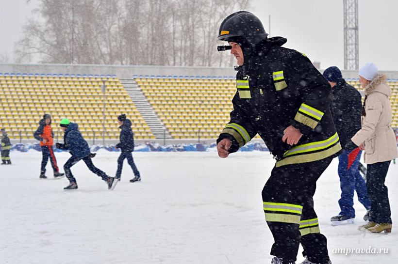 Сегодня, 21 февраля, на стадионе «Амур» города Благовещенска впервые прошел противопожарный флешмоб – спасатели и пожарные в полной боевой экипировке встали на коньки. На льду катка они провели игры с детьми, а также посоревновались в перетягивании пожарного рукава. Посетителям катка вручали памятки о мерах пожарной безопасности и правилами поведения на льду. Весь день на стадионе «Амур» звучали песни о людях героической профессии, а все желающие могли сфотографироваться со спасателями и пожарными. «Подобное мероприятие на территории Приамурья мы проводим впервые, – рассказал врио начальника главка МЧС России по Амурской области Игорь Смирнов. – Мы хотим привлечь внимание амурчан к такой важной проблеме, как обеспечение безопасности жизни, и напомнить: соблюдение правил пожарной безопасности, правил поведения на водоемах – гарантия безопасности как вашей собственной, так и ваших близких и родных».