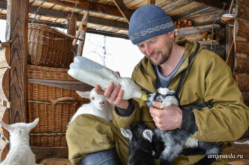 «Старовер» Роман разводит коз, делает йогурт и печет хлебНа свежевыпавшем снегу резвятся несколько белоснежных козлят двух дней от роду. Только что отпоенные теплым молоком, они словно растут на глазах. «Всего же козлят с десяток; в этот раз опять на свет появилось больше козлов, хотя в хозяйстве нужнее козочки», — рассказывает создатель небольшого, но крепкого ЛПХ, молодой, но уже многодетный отец Роман Матуйзо. Роман с улыбкой называет себя старовером. Но икон не видно, и кажется, что его религия — бережное отношение к природе и ответственность за то, за что взялся. У него голубые глаза, русая борода и славянские корни, которые особенно заметны, когда он говорит о земле и доме.