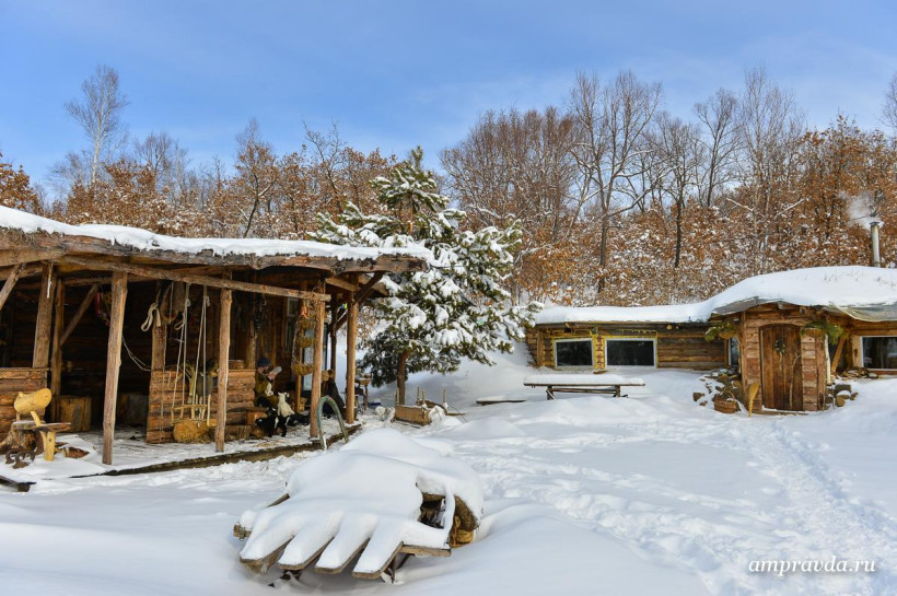 При строительстве землянки предприимчивый землевладелец максимально использовал преимущества ландшафта и природные материалы — дом вырыт в сопке, а его каркас обшит деревом и камнем. В доме установлена печка. Из современного — септик и пластиковые окна. Получился экологически чистый дом.