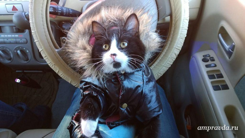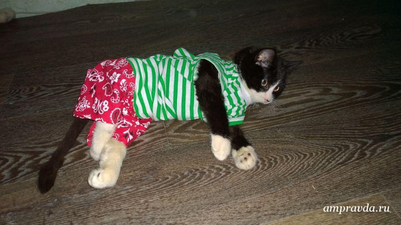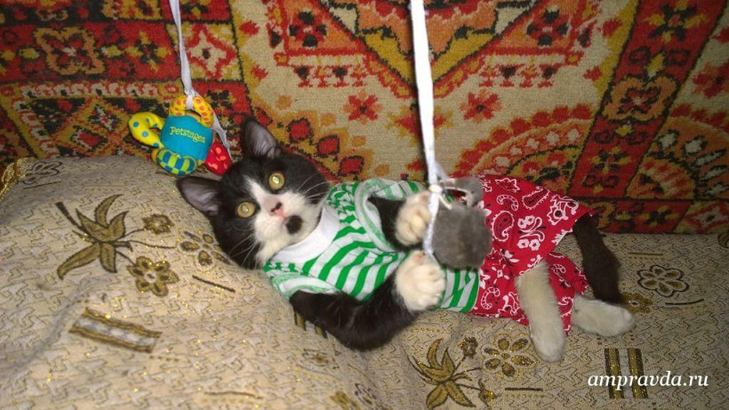 Маленького черно-белого котенка в мокрой канаве нашла дочь благовещенки Инны в сентябре прошлого года. Девочка принесла его домой: малыш оказался чистеньким, ухоженным и домашним — видимо, он оказался на улице совсем недавно. Котенок казался внешне здоровым, только задние лапы и хвост безжизненно свисали вниз. Следов наезда автомобиля и укуса собак видно не было. Врач после ренгена совершил ошибку, решив, что у животного сломан позвоночник, и наложил ему гипс.