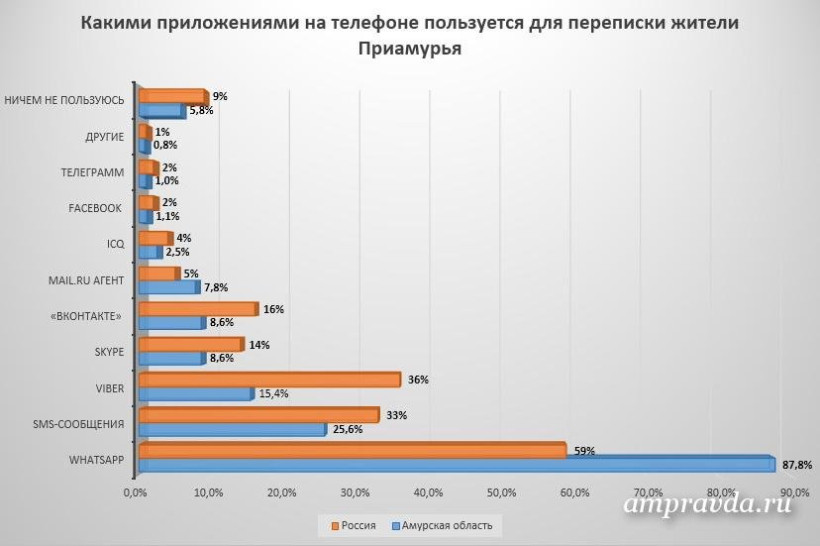 На первом месте у амурчан приложение WhatsApp. Им пользуются 87,8 % опрошенных. На второй строчке рейтинга, как ни странно, оказался традиционный сервис SMS-сообщений (25,6 %). Следом идет мессенджер Viber с показателем 15,4 %. Самой невостребованной программой для текстовой переписки в Амурской области оказалась «Телеграм» — ее использует 1 % амурчан.