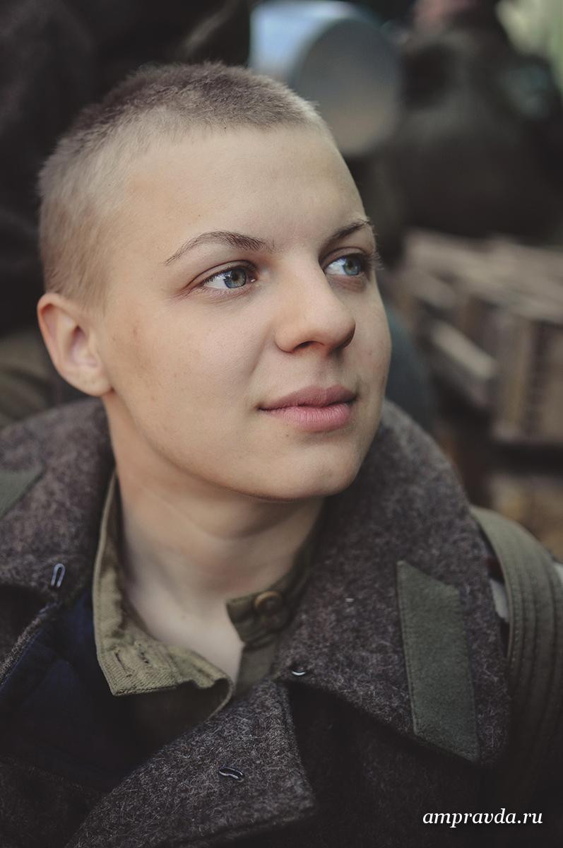 Съемки фильма шли два года: летом 2012-го под Псковом была отснята вторая, основная часть картины со всеми военными сценами. А первую часть фильма — время формирования и подготовки батальона к войне — снимали весной 2013 года в Санкт-Петербурге. Именно в них на протяжении двух месяцев и участвовала экс-амурчанка. «Постригли, выдали шинели, фуражки, ботинки. Кстати, у каждой девушки костюмы были именные», — говорит Олеся.