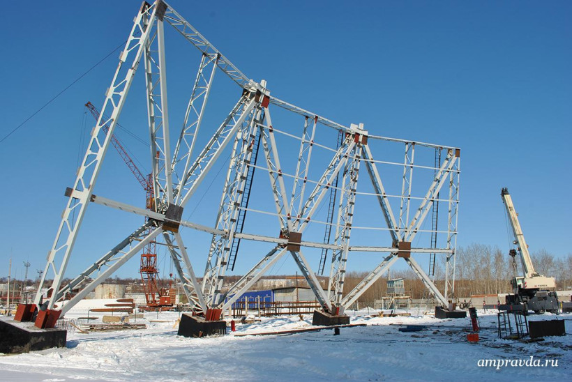 Скелет башни представляет из себя стальной каркас, общий вес которого почти 500 тонн. Часть конструкций уже доставлена на площадку укрупнительной сборки.