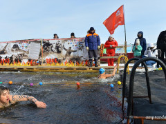 Турнир по зимнему двоеборью «Железный человек» прошел в Благовещенске на берегу Зеи. В этом году соревнования посвящены 70-летию Победы в Великой Отечественной войне. Сначала 70 участников с городов Дальнего Востока и Сибири, а также гражданин Китая проплывали в проруби от 25 до 50 метров, а затем преодолевали дистанцию в сто метров по суше.