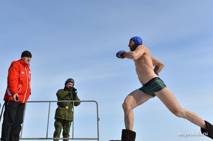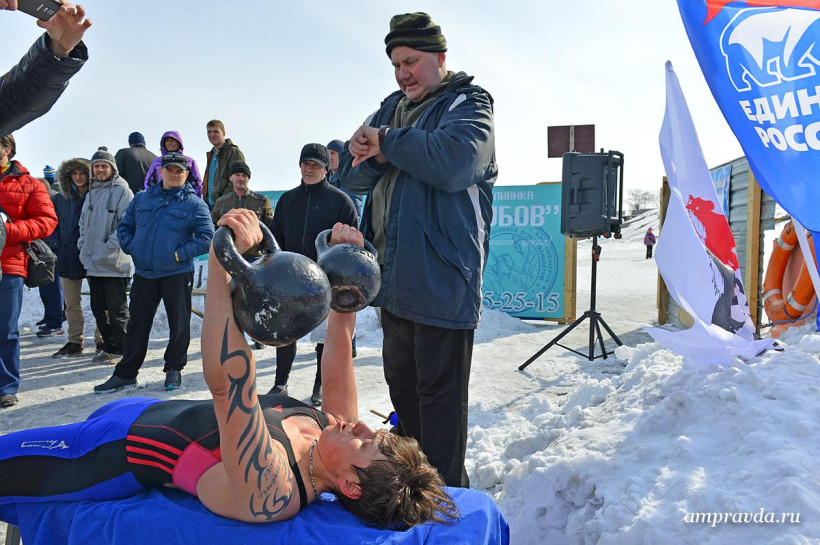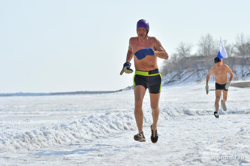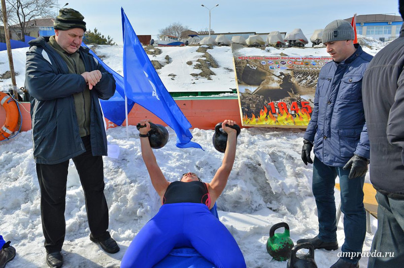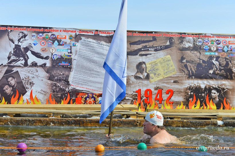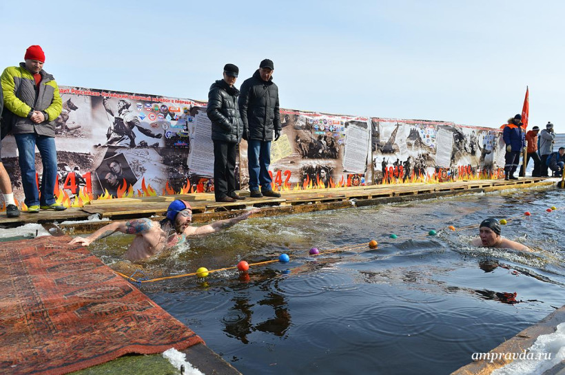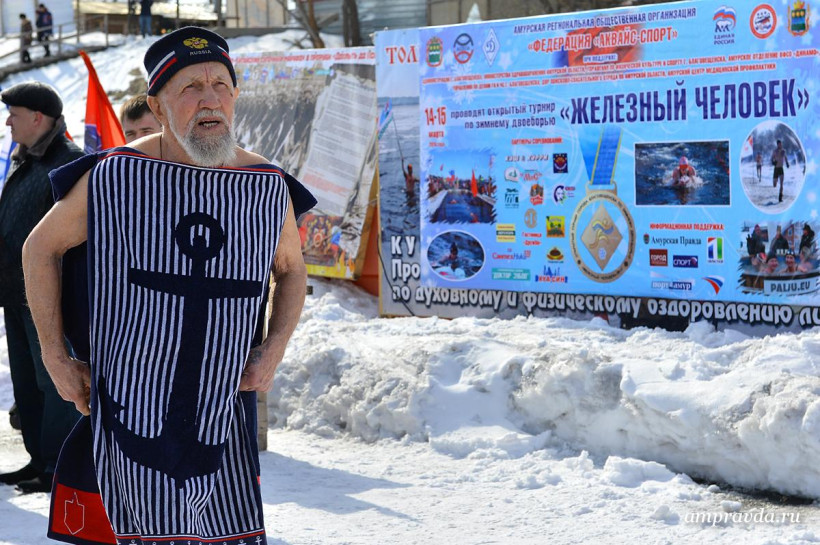 Турнир по зимнему двоеборью «Железный человек» прошел в Благовещенске на берегу Зеи. В этом году соревнования посвящены 70-летию Победы в Великой Отечественной войне. Сначала 70 участников с городов Дальнего Востока и Сибири, а также гражданин Китая проплывали в проруби от 25 до 50 метров, а затем преодолевали дистанцию в сто метров по суше.