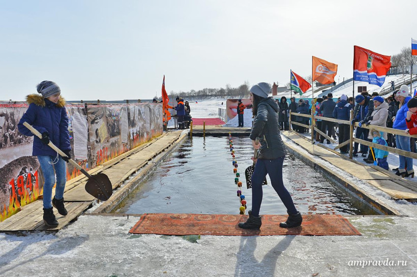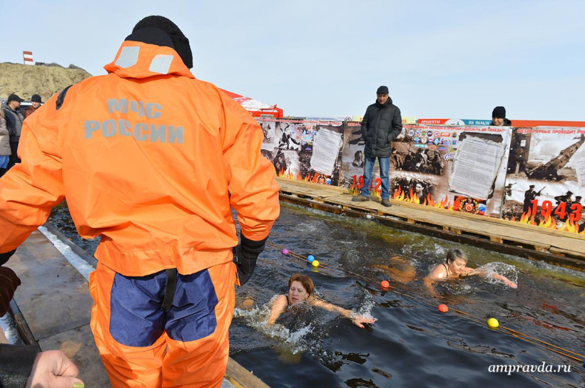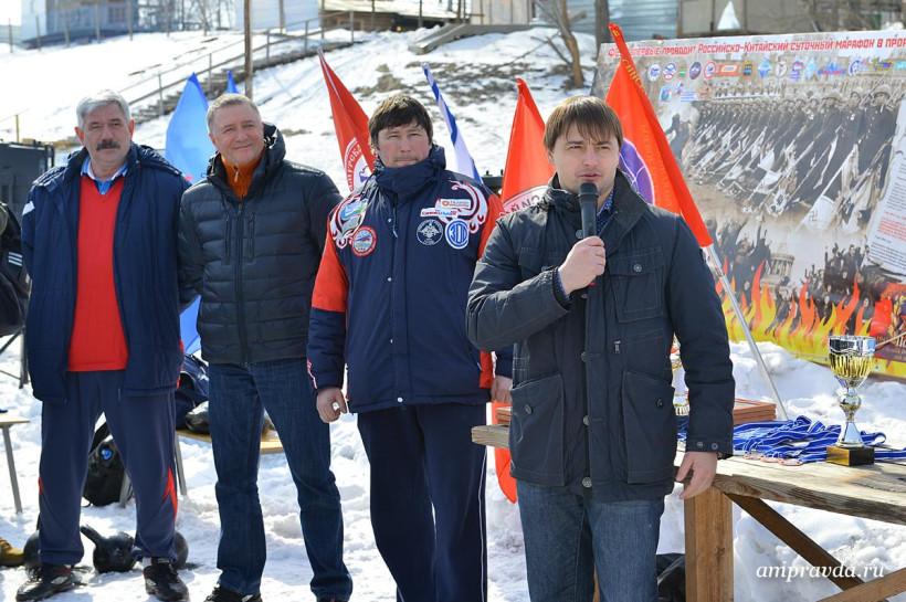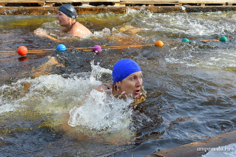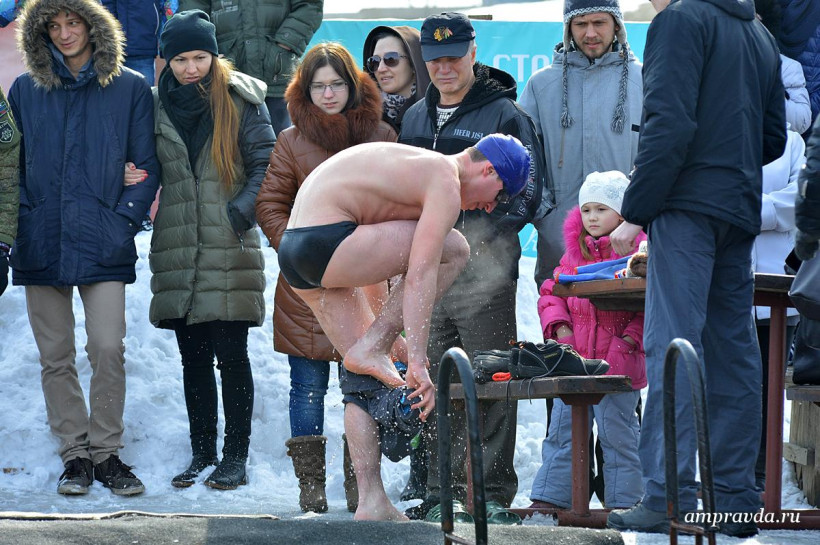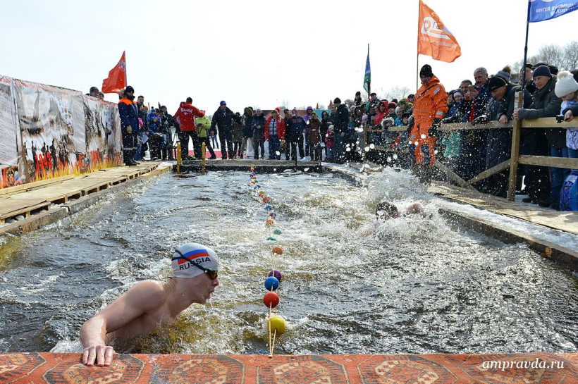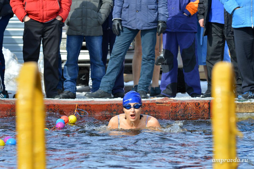 Турнир по зимнему двоеборью «Железный человек» прошел в Благовещенске на берегу Зеи. В этом году соревнования посвящены 70-летию Победы в Великой Отечественной войне. Сначала 70 участников с городов Дальнего Востока и Сибири, а также гражданин Китая проплывали в проруби от 25 до 50 метров, а затем преодолевали дистанцию в сто метров по суше.
