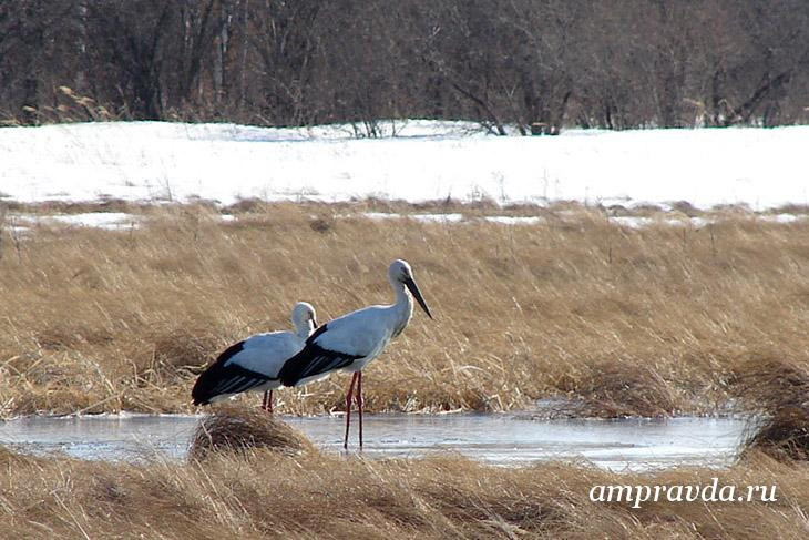 Первые две особи дальневосточного аиста были замечены еще 16 марта в районе села Новопокровка Архаринского района. Птиц обнаружил инспектор Хинганского заповедника Сергей Куницкий. 19 марта трех особей заметил в устье реки Домикан житель поселка Архара Виталий Василевский. А сегодня, 20 марта, бывший председатель Архаринского охотобщества Сергей Лиханов отметил двух особей этого вида, кормящихся на разливах талой воды в пойме реки Архара в районе пересечения ее федеральной трассой «Амур».