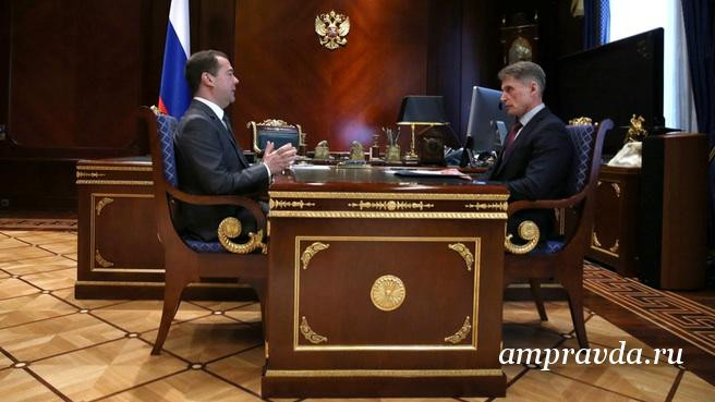 Антикризисные мероприятия, ситуация на рынке труда и сокращение шимановских железнодорожников, подготовка региона к предстоящей посевной и перспективы поставок мяса в Китай — эти и другие темы обсудили на встрече председатель Правительства РФ Дмитрий Медведев и губернатор Амурской области Олег Кожемяко. Она прошла этой ночью по амурскому времени в подмосковных Горках. В начале разговора премьер отметил: «Такое ощущение, что мы с вами уже раз в месяц видимся, не реже». «Ситуация требует этого», — подчеркнул амурский губернатор.