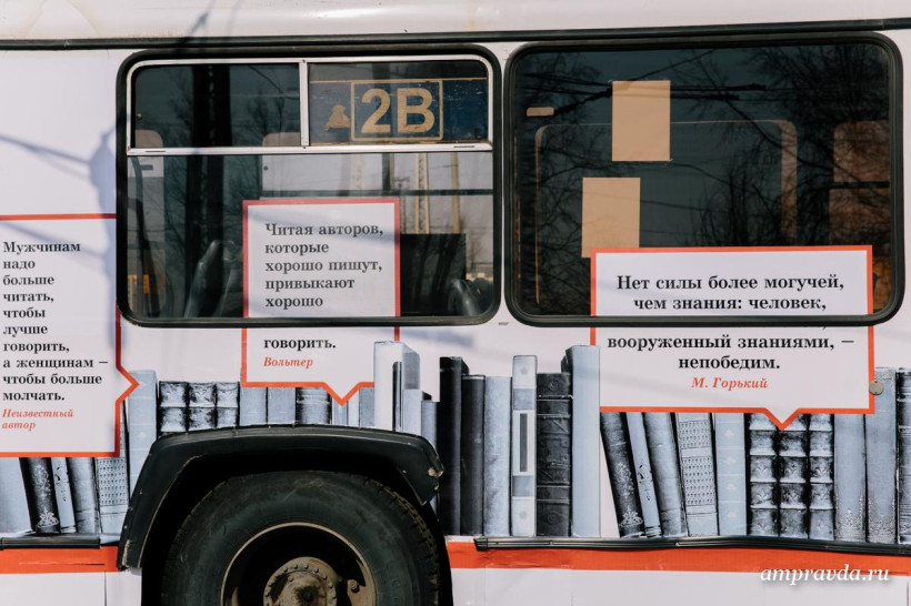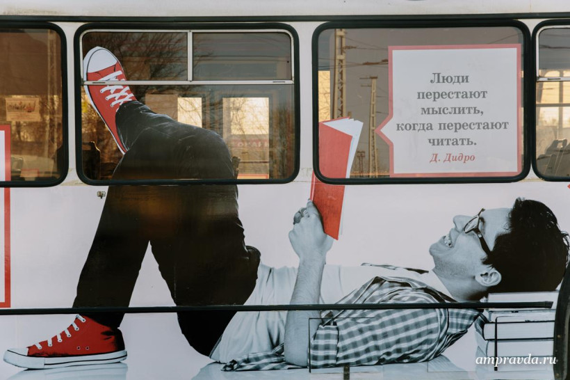 — Конечно, мы не строим иллюзий на тему того, что человек сел в наш троллейбус и сразу стал начитанным и образованным, но напомнить о том, что когда-то мы были самой читающей нацией, стоит, — прокомментировала она. — В нашей рекламной кампании широко используются крылатые фразы и афоризмы известных авторов, один из них — знаменитого философа Дидро. Он звучит как «Люди перестают мыслить, когда прекращают читать» и имеет очень глубокий смысл. Ведь книга не только расширяет кругозор и тренирует память, она учит глубоко мыслить, помогает избавиться от слов-паразитов, развивает способность к сопереживанию и так далее. Очень хотелось бы организовать в троллейбусе обмен книгами по системе буккроссинга. Планируется, что книги будут находиться в свободном доступе и их можно будет взять с собой, а потом вернуть на место или положить взамен другую книгу. А еще здесь можно будет приобрести свежий номер «Амурской правды».