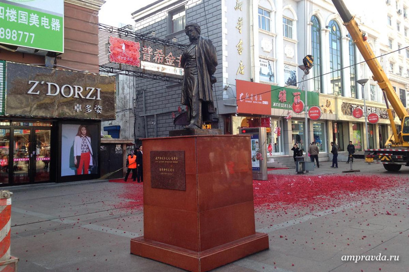 В последний момент ошибки на табличке были исправлены28 марта ровно в 10 часов 38 минут на центральной Пешеходной улице китайского города Хэйхэ открыли памятник Александру Сергеевичу Пушкину (ФОТО).