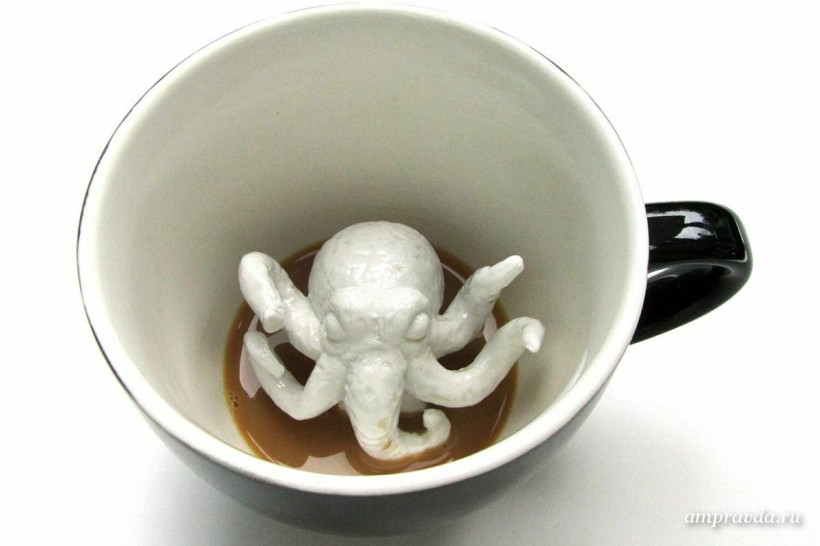 Такая кружка легко взбодрит вас с утра не только из-за налитого в нее кофе, но и благодаря неожиданной находке на дне. Главное, в этот момент не поперхнуться напитком или печенькой. Любители острых ощущений могут обнаружить на дне кружки на выбор акулу, крокодила или змею.