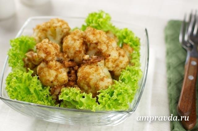 Цветная капуста — 1 кочан, сухари панировочные — 130 г, чеснок — 5 зубчиков, соль, перец, растительное масло — 8 ст. л., сахар.