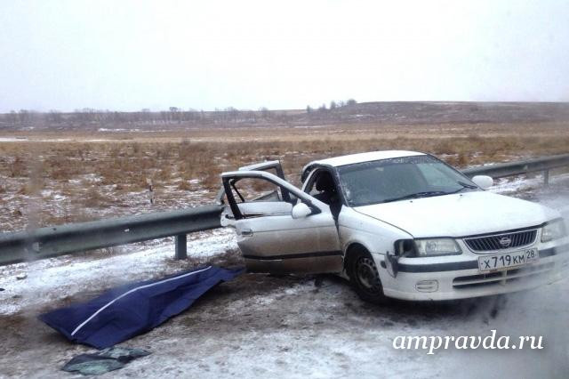 Авария случилась в 16 часов 55 минут в Благовещенском районе на 108 км автодороги «Подъезд к Благовещенску». Автомобиль Nissan Sanny, водитель которого не справился с управлением и выехал на полосу встречного движения, столкнулся с Nissan Tiida. От полученных травм виновник ДТП скончался на месте происшествия, пассажирка второго автомобиля доставлена в больницу. Участниками аварии стали еще две машины — Toyota Raum и Toyota Mark II, они пытались уйти от столкновения и наехали на леерное ограждение. Находившиеся в этих машинах люди не пострадали.