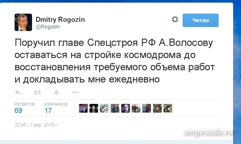 «Поручил главе Спецстроя РФ А. Волосову оставаться на стройке космодрома до восстановления требуемого объема работ и докладывать мне ежедневно», — написал в своем «Твиттере» зампред российского правительства Дмитрий Рогозин.