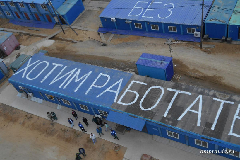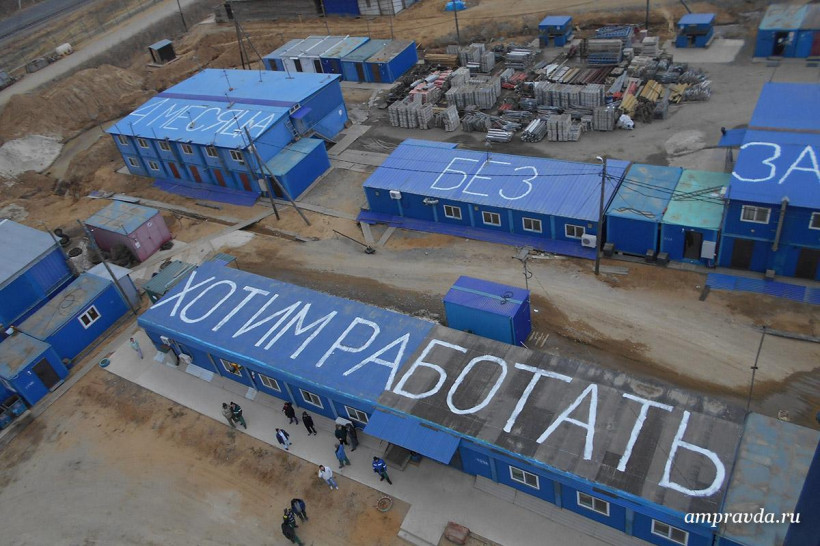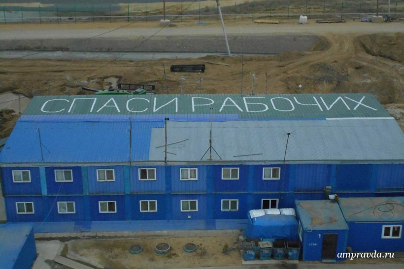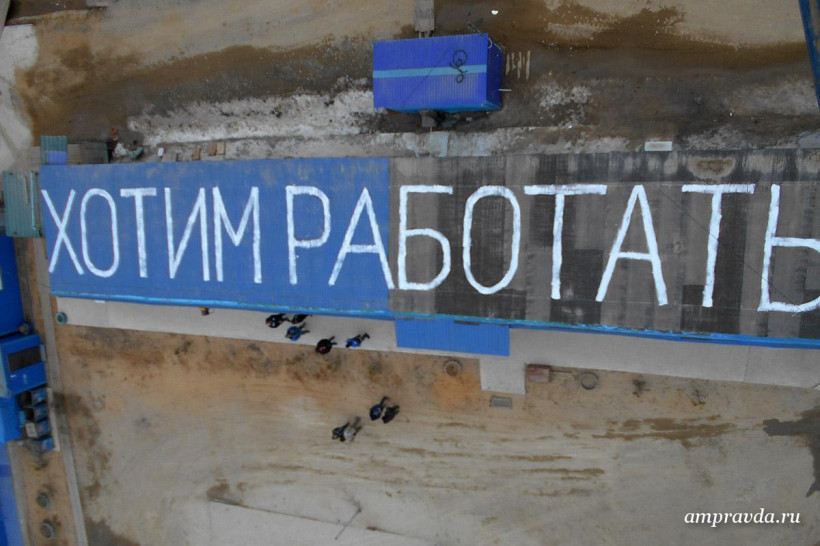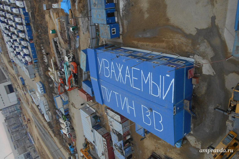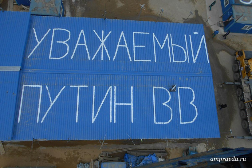 «Уважаемый Путин В. В.! Мы четыре месяца без зарплаты! Спаси рабочих! Мы хотим работать!» Такое сообщение написали вчера, 13 апреля, строители космодрома Восточный — работники ЗАО «Тихоокеанская мостостроительная компания» — краской на крышах производственных зданий и вахтовых вагончиках в Углегорске. Фотоснимки необычного обращения они отправили на прямую линию с президентом России и в редакцию «Амурской правды».