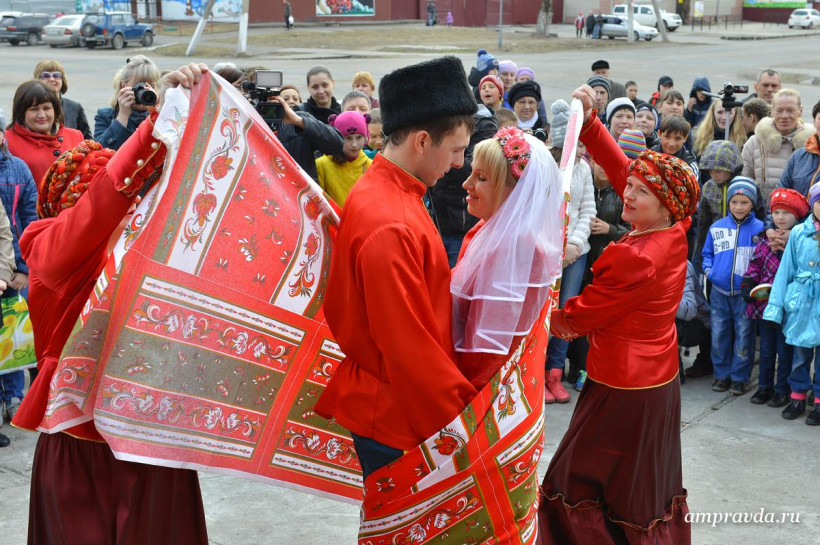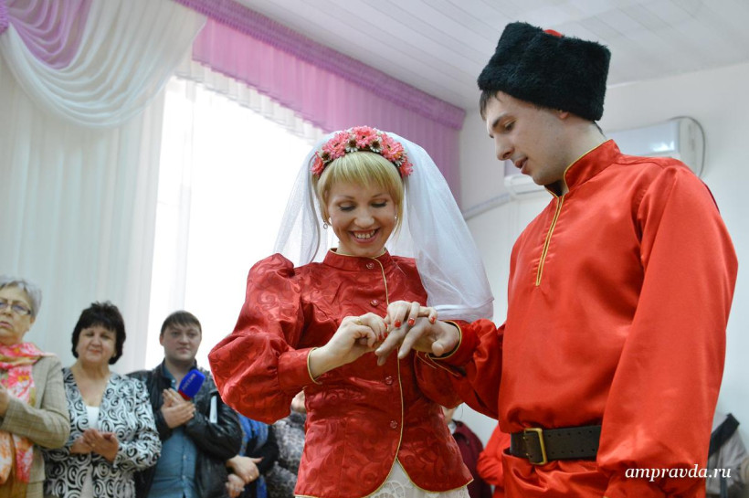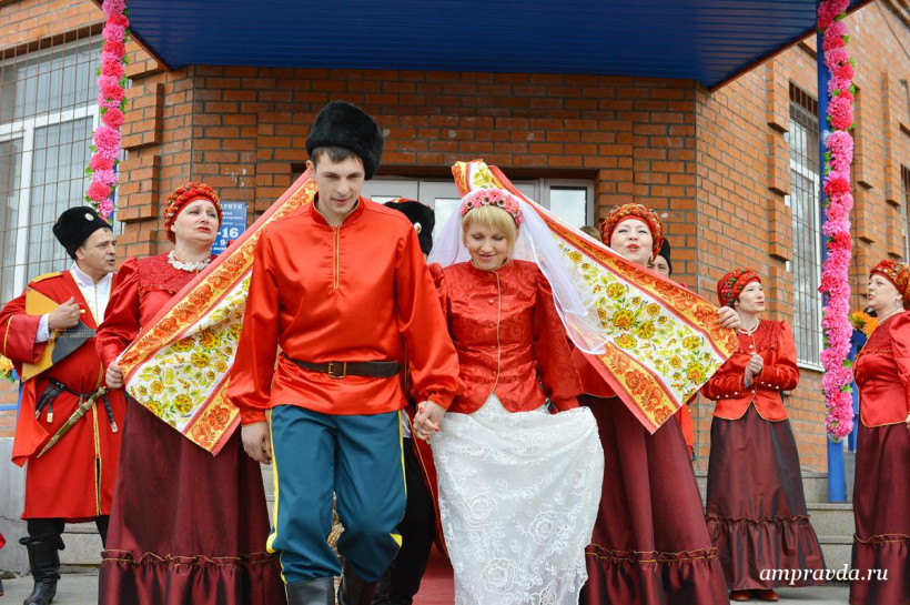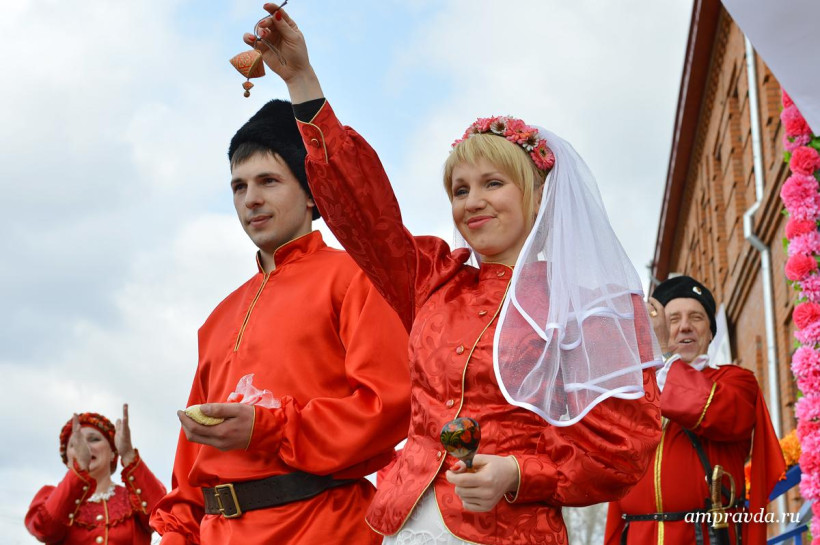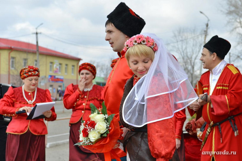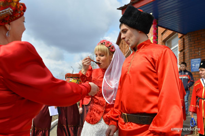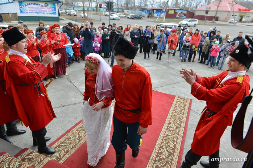 Казачьи песни, катание на лошадях, народные костюмы и гадание на будущую семейную жизнь. Сегодня, 18 апреля, накануне русского праздника новобрачных — Красной горки, в Тамбовке прошла необычная свадьба – в казачьем стиле. Молодожены Дмитрий Донец и Яна Осипова, которые стали 23-й зарегистрированной в этом году тамбовской парой, признались, что свадьбу на Красную горку специально не планировали, а когда сотрудники ЗАГСа предложили отметить ее в казачьем стиле отказываться не стали. «Такая свадьба запомнится на всю жизнь», — отметили молодые. «Мало того, по нашей статистике союзы, которые были заключены на этот праздник, не распадаются», — добавила руководитель амурского управления ЗАГС Наталья Томилова и пожелала молодоженам долгой и счастливой семейной жизни. На казачьей свадьбе в селе Тамбовка погулял фотокорреспондент «Амурской правды» Андрей Ильинский.
