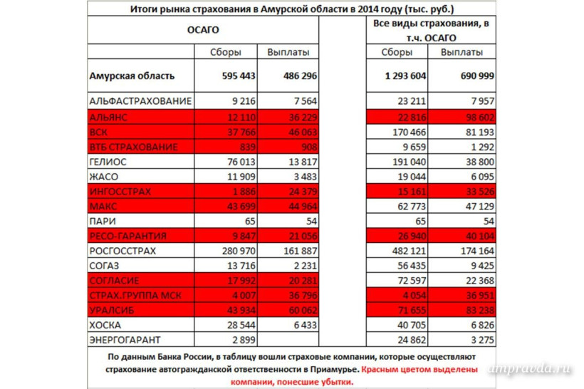 По данным Банка России, в 2014 году при оформлении полисов ОСАГО страховщики области заработали более 595 миллионов рублей. 80 процентов от этой суммы, или 486 миллионов рублей, было выплачено амурским автомобилистам в качестве возмещения убытков. Оформлено почти 191 тысяча договоров автогражданской ответственности. Несмотря на общую прибыльность рынка страхования девять из 17 компаний, осуществляющих в Приамурье страхование по ОСАГО, понесли многомилионные убытки.