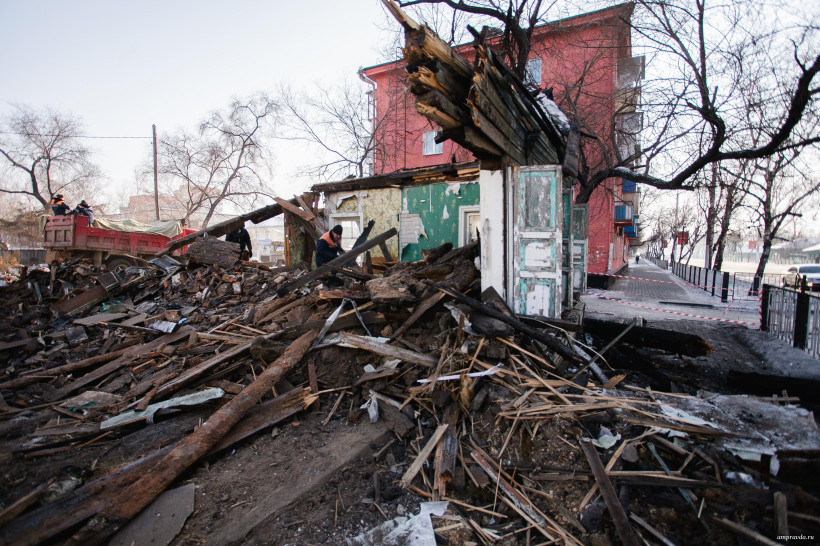 Спасатели, разобрав завалы, организовали подход к пострадавшему для врачей скорой помощи. В частично разобранном бараке, как рассказала сотрудник амурского центра ГЗ и ПБ Ирина Санжировская, не было лестниц.