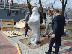 Скульптура российскому солдату с котом в руках доставлена сегодня, 28 апреля, в Белогорск. 400-килограммовый груз прибыл из города Касли.