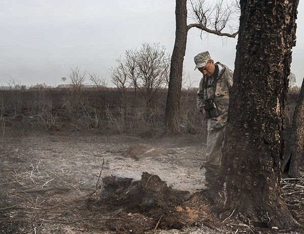 Младший научный сотрудник Хинганского заповедника Денис Кочетков запечатлел тушение пожара и его последствия на фотоаппарат. Лесничие не дали огню перейти через заболоченную долину речки Борзя в релку, за которой находится летняя резиденция станции реинтродукции с вольерами и журавлями. Им удалось связаться с одной из пожарных групп с вездеходом, ликвидировавшей часть пожара. С помощью тяжелой техники пожарным удалось заехать в болото и пустить встречный пал.