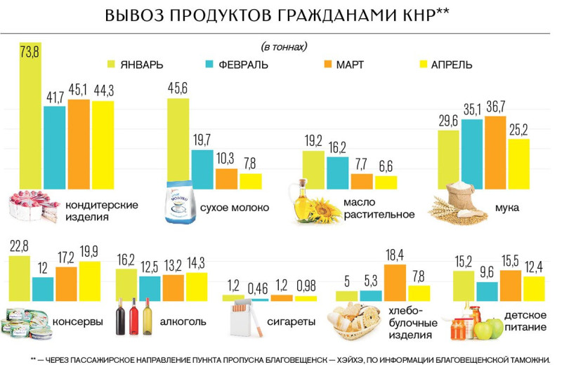 С января по апрель объем экспорта в Приамурье вырос на четверть по сравнению с тем же периодом прошлого года и составил 112 миллионов долларов. Стоимость экспортных поставок впервые превысила импорт — в 2,7 раза. При этом, как сообщает Благовещенская таможня, 36,7 % стоимости экспорта пришлось на вывоз сельхозсырья и продуктов. Доля этих товаров по сравнению с тем же периодом прошлого года колоссально выросла — в 2014-м они занимали в структуре экспорта меньше процента. Продукты в КНР вывозят не только грузовиками, но и на собственных спинах — ежедневно граждане Поднебесной для «личных нужд» везут в Хэйхэ сотни килограммов хлеба, кондитерских изделий, сигарет, сотни литров алкоголя.