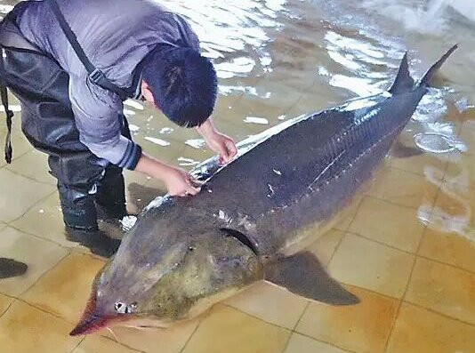 Рыбина, не успевшая пройти нерест, доставлена на крупнейшую в Китае базу по обитанию осетровых рыб, расположенную в уезде Фуюань.