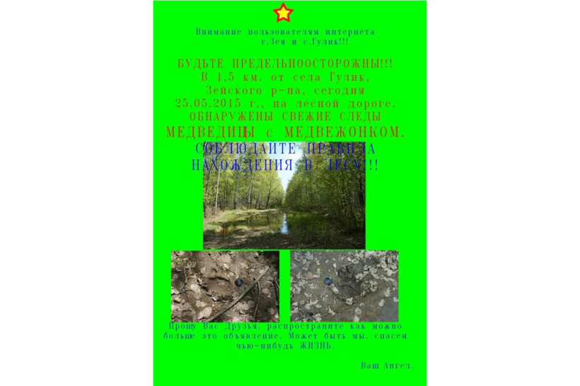 25 мая в Зейском районе местный житель обнаружил следы медведицы с медвежонком. По информации очевидца, встреча произошла в полутора километрах от села Гулик. Этот населенный пункт находится в шести километрах от райцентра — города Зеи.