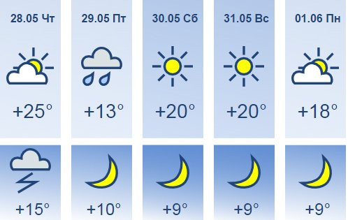 По области: переменная облачность, местами слабые и умеренные кратковременные дожди, грозы, ночью в отдельных районах туман. Ветер южный, юго-восточный 0—5 м/сек., местами до 14 м/сек. Температура ночью — 9—14 градусов выше нуля, по северу — 1—4. Днем столбики термометров покажут +22—27, по северу — 12—17 выше нуля.