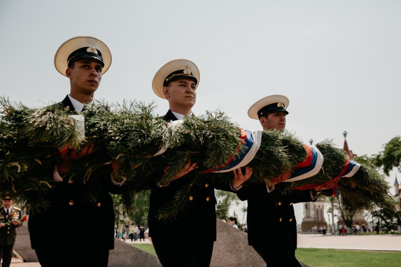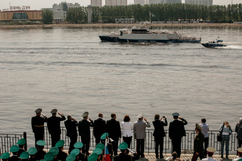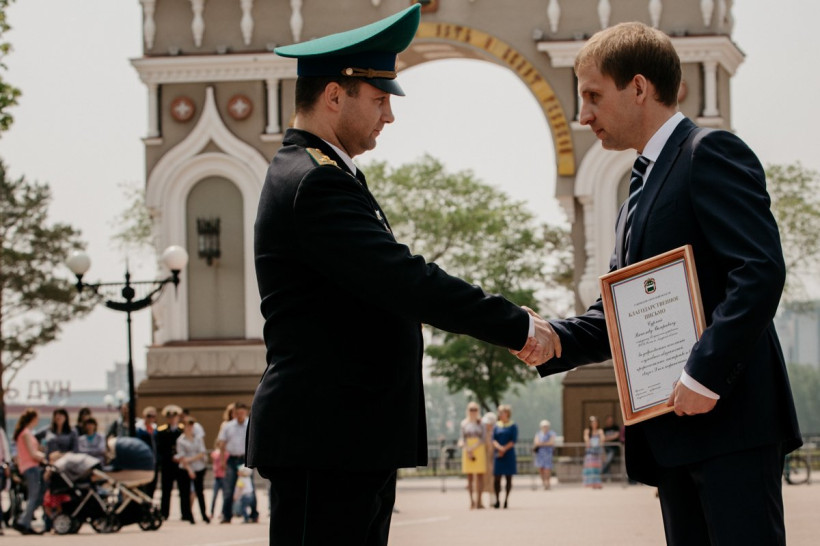 Показательные выступления прошли на площади ПобедыПограничники сегодня отмечают свой профессиональный праздник. В Благовещенске торжественные мероприятия начались на площади Победы с торжественного построения сотрудников амурского Погрануправления ФСБ России и возложения гирлянд к памятнику воинам-амурцам. После здесь состоялись показательные выступления сотрудников погрануправления. Бравые ребята продемонстрировали задержание нарушителей границы на автомобиле и с помощью пограничной собаки, приемы рукопашного боя, а также общий курс дрессировки четвероногих воинов из Николаевки. Позже по Амуру прошли пограничные катера и корабли береговой охраны.
