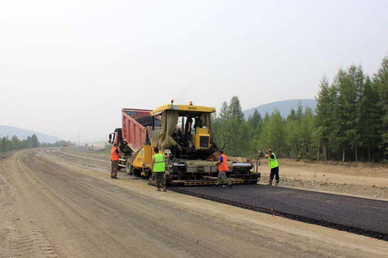 На объекте работают асфальтобетонный завод французской фирмы ERMONT, асфальтоукладчик и катки немецкой фирмы BOMAG. Транспортировка асфальта осуществляется на современных самосвалах VOLVO c подогревом кузова. Для ритмичной работы завода на базе в Тынде имеется достаточное количества битума, щебень производится на дробильных установках на участке «Джелтулак», отсев поставляется с карьера Курьян. Как подчеркивают дорожные рабочие, все теперь зависит от погоды. Именно погодные условия стали препятствием для раннего разворота работ по укладке асфальтобетона. В середине мая на участке еще был снег, а стабильная положительная температура установилась только недавно. Устройство дорожной одежды можно вести только при плюсовой температуре и отсутствии осадков.
