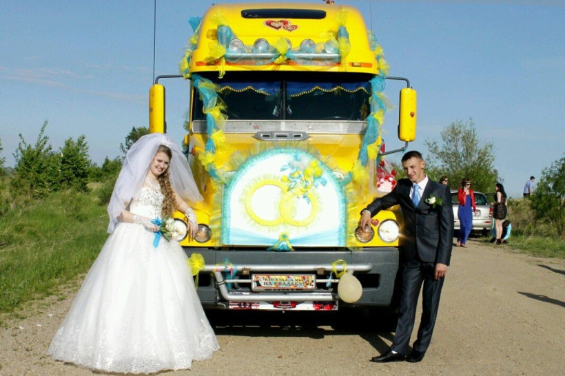 Осуществить мечту о необычном свадебном кортеже помог папа невесты. Он профессиональный дальнобойщик и уже давно владеет компанией по грузоперевозкам. Среди его автопарка пара и выбрала три американских тягача: два желтых и один красный. Как призналась 21-летняя новобрачная, самым сложным было придумать, как украсить такие большие машины — все предлагаемые банты и ленты в белогорских свадебных салонах терялись на фоне таких громадин.