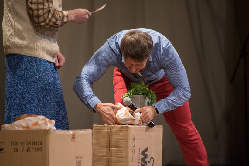 Количеству реквизита, использованного на сцене, могла бы позавидовать столичная театральная труппа: рояль, холодильник, раскладушки, диван, столы, туба, саксофон, барабан, кандалы и даже дорожные знаки. А юмористы так мастерски перевоплощались в своих героев, что их невозможно было узнать. Главный голос юмористического шоу Вячеслав Мясников спел под гитару любимые песни про кота, «Новый год — мандарин в рот» и трогательный хит про папу, параллельно организовав массовый сеанс селфи у сцены.
