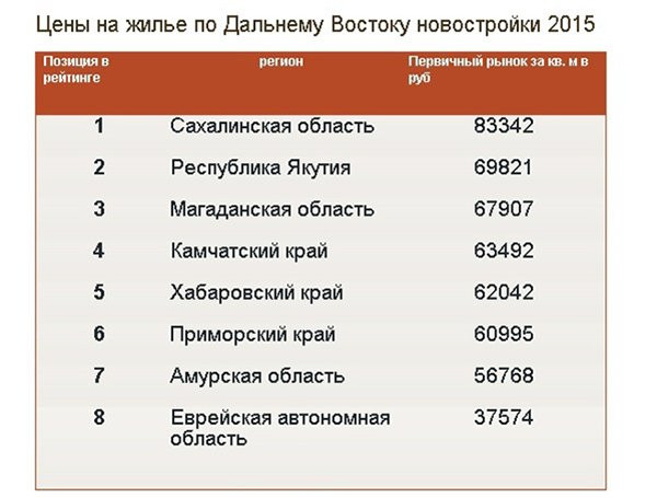 Самые дорогие квартиры в новостройках по итогам первого квартала 2015 года оказались в Сахалинской области — 83 342 рубля за один квадратный метр — абсолютный рекорд по стоимости жилья на Дальнем Востоке. Амурская область вместе с Приморьем и ЕАО стали регионами с наиболее выгодными ценами для покупки квартиры на первичном рынке жилья, констатируют «Дальневосточные рейтинги».