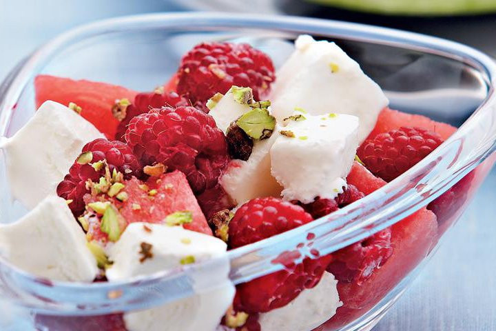 Положите мороженое в морозильник на 2 часа. Оно должно стать «каменным». Мякоть арбуза порежьте кубиками примерно 2 х 2 см. Полейте малиновым ликером и поставьте на 30 минут в холодильник. Посыпьте малину сахаром и поставьте в холодильник на 30 минут. Тонким острым ножом порежьте пломбир кубиками и аккуратно перемешайте его с арбузом и малиной. Выложите все в миску и посыпьте мелко порубленными фисташками.