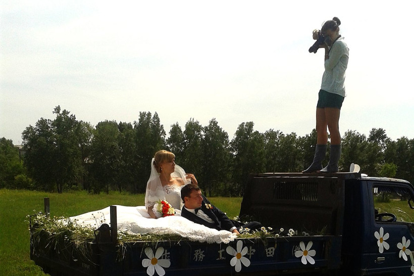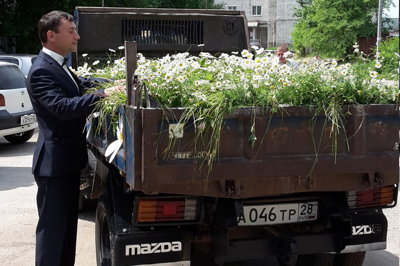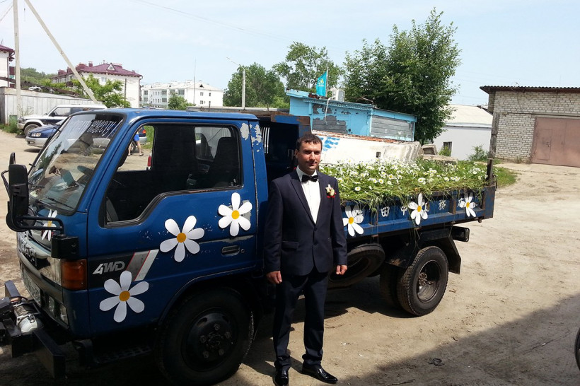 В свободненский загс будущие супруги приехали на разных автомобилях. Николай — на том, что в ромашках. После регистрации и всех поздравлений украшенный грузовик отправился в гараж на двухдневную стоянку. После чего увядшие цветы вывезли на свалку. «Жалко, но что делать. Главное, что сюрприз удался», — говорит новоиспеченный муж.